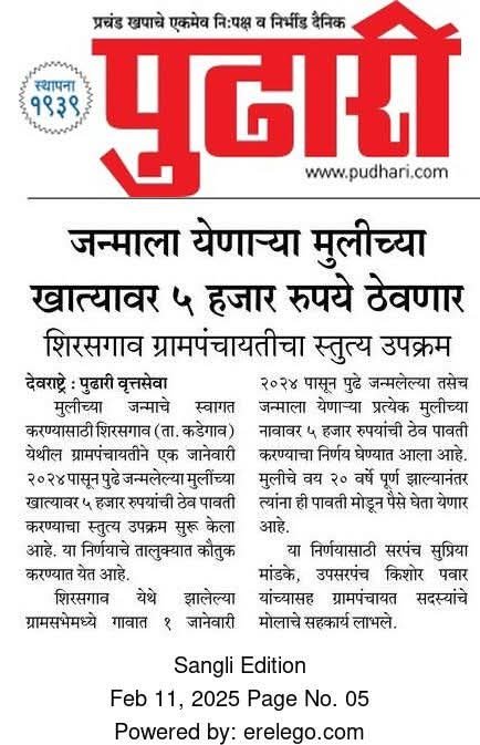 मुलीच्या जन्माचे स्वागत करण्यासाठी शिरसगाव (ता. कडेगाव) येथील ग्रामपंचायतीने एक जानेवारी २०२४ पासून पुढे जन्मलेल्या मुलींच्या खात्यावर ५ हजार रुपयांची ठेव पावती करण्याचा स्तुत्य उपक्रम सुरू केला आहे. या निर्णयाचे तालुक्यात कौतुक करण्यात येत आहे.